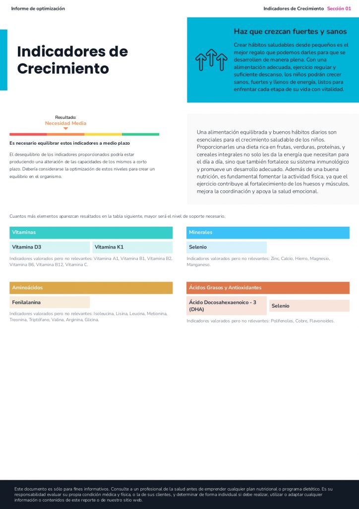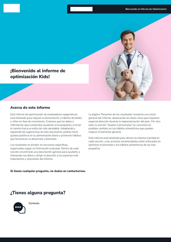 El informe de optimización Kids, ha sido diseñado por especialistas del sector que colaboran con nuestro equipo médico para todos aquellos profesionales de la salud que desean optimizar el bienestar de sus clientes más pequeños a partir del primer año de vida y hasta los 7.